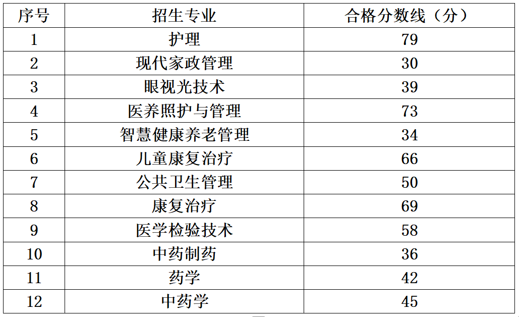 根据《贵州省教育厅关于做好2025年普通高等学校专升本工作的通知》(黔教函〔2024〕69号)及《贵州省2025年普通高等学校专升本考试招生工作方案》文件精神,贵阳康养职业大学2025年专升本专业课考试已于4月30日结束。学校根据《贵阳康养职业大学2025年普通高等学校专升本考试招生章程》有关规定,分专业不分科类,划定各专业的专业课考试成绩合格分数线,并报贵州省招生考试院同意,现将划定的具体分数线(不含退役士兵)公布如下: