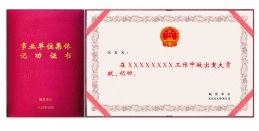 证书规格为245×170mm。封面选用大红色丝绸材料,烫金印制“事业单位集体记大功证书”字样。内页为浅黄色,花边图案为卷草纹,硬卡纸。其中,左上部分为获奖集体名称(字体为大标宋简体,23号字),中间部分为受到何种奖励(字体为魏碑,44号字),右下部分为颁奖单位印章和日期(字体为大标宋,18号字)。