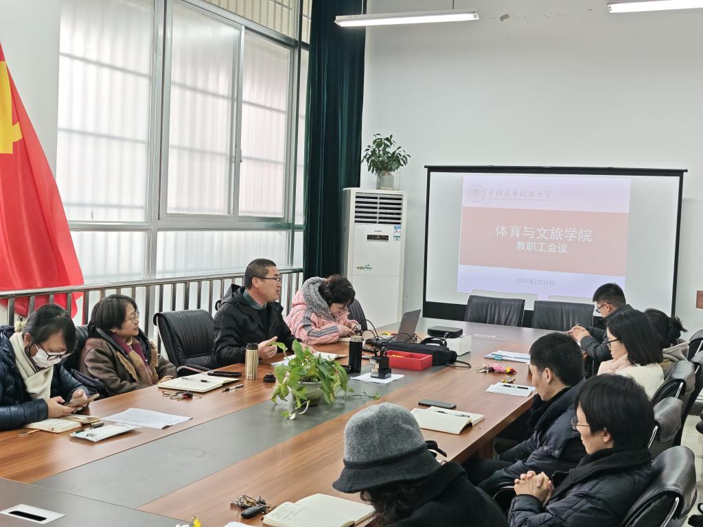 2025年2月20日上午十点, 体育与文旅学院在学院行政会议室召开了开学工作会议,学院全体领导以及全体教师参加了此次会议。